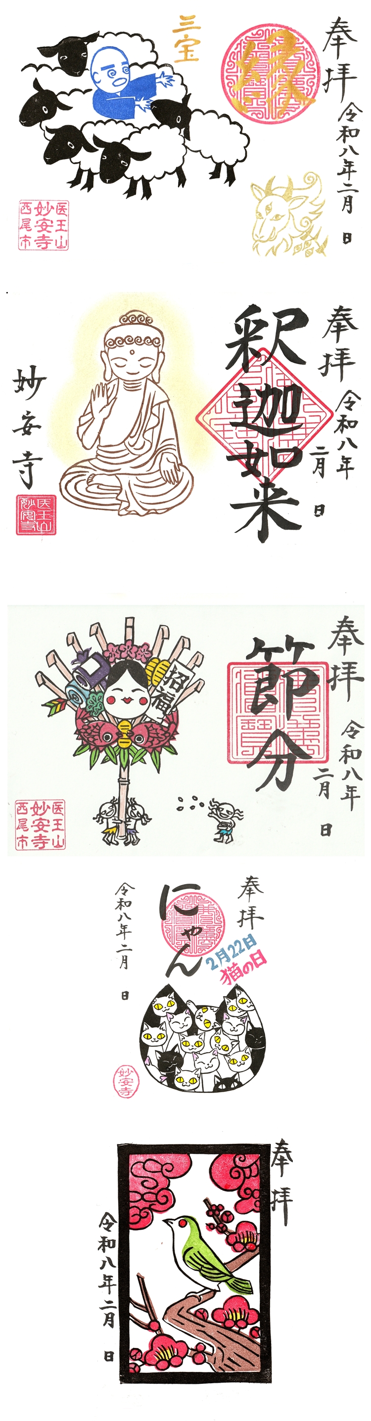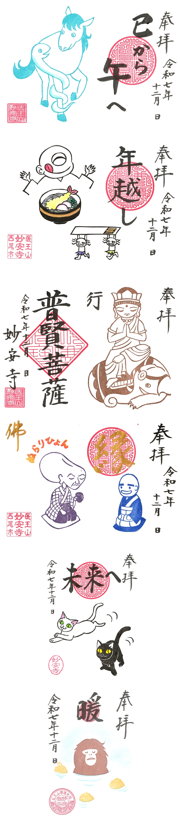 上記 見開き3種類、片面3種類、そしてお誕生日御朱印(4面)が妙安寺の基本御朱印となります。